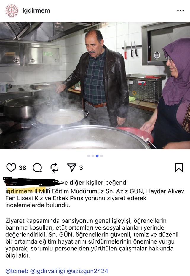 İl Millî Eğitim Müdürlüğü tarafından yapılan paylaşımda ise ziyaretin amacına ilişkin şu ifadeler yer aldı: "Ziyaret kapsamında pansiyonun genel işleyişi, öğrencilerin barınma koşulları, etüt ortamları ve sosyal alanları yerinde değerlendirildi. Sn. Gün, öğrencilerin güvenli, temiz ve düzenli bir ortamda eğitim hayatlarını sürdürmelerinin önemine vurgu yaparak, sorumlu personelden yürütülen çalışmalar hakkında bilgi aldı." Paylaşımda Milli Eğitim Bakanlığı, Iğdır Valiliği ile Iğdır Milli Eğitim Müdürü Aziz Gün'ün sosyal medya hesapları etiketlendi.