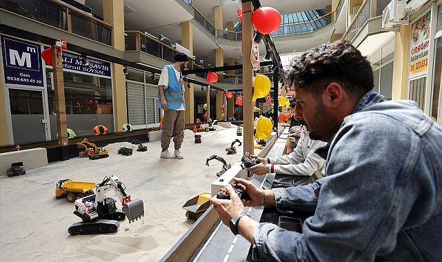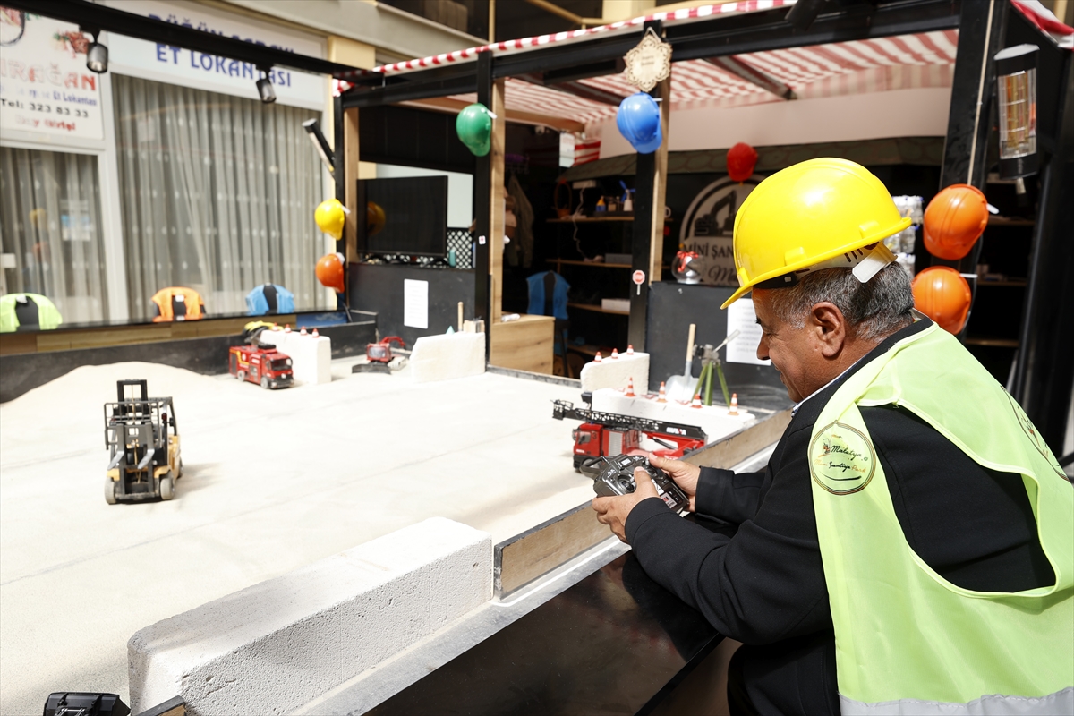 Battalgazi ilçesindeki bir iş merkezinin zemin katına kurulan alanda, kum havuzları, minyatür kepçeler, yükleyiciler ve çeşitli görev istasyonlarından oluşan alanlarda çocuklar ve yetişkinler, şantiye ortamını andıran düzen içinde farklı aktiviteler gerçekleştiriyor.
