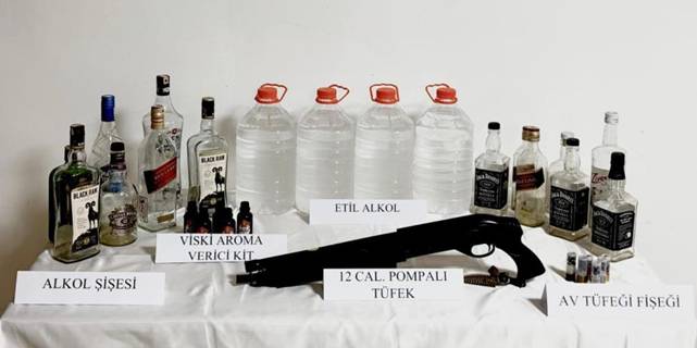 Operasyonlar kapsamında yapılan aramalarda; 1 adet elektrikli sigara sarma makinesi, 181 bin 940 adet sigara filtresi, 12 bin 877 gram kıyılmış sarmalık tütün, 907 adet makaron, 20 litre etil alkol, 5 adet alkol aroma kiti, 14 adet doluma hazır alkol şişesi, 1 adet ruhsatsız av tüfeği ele geçirildi.
