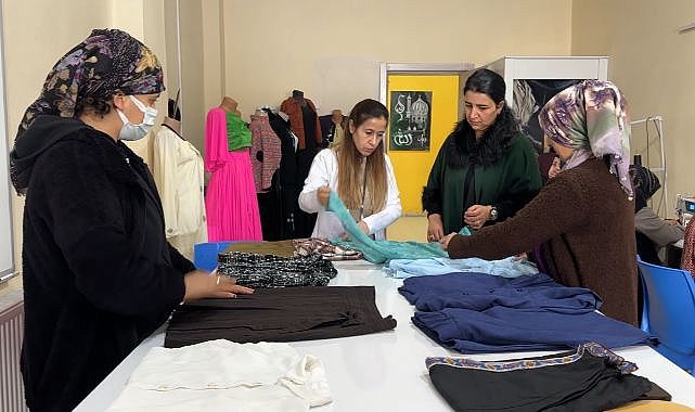 Merkezde açılan kurslara katılan kadınlar, mesleki beceri kazanmanın yanı sıra psikososyal destek eğitimleriyle de sosyalleşme imkanı buluyor. Giyim Üretim Kursu'nda eğitim gören kursiyerler, ilk aşamada geri dönüşüm malzemeleriyle pratik yaparak tecrübe kazanıyor. Kesim, dikim ve ölçü alma tekniklerinde uzmanlaşan kadınlar, tecrübe kazandıktan sonra kurum tarafından sağlanan kumaşlarla kendileri ve çocukları için kıyafetler dikiyor.