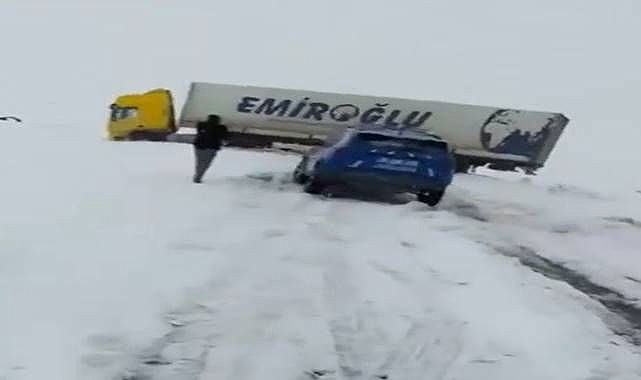 Kaza, Kars'ın Arpaçay ilçesinde meydana geldi. Kars'tan Çıldır-Gürcistan istikametine seyir halindeki tır, yolun kaygan olması sonucu sürücüsünün direksiyon hakimiyetini kaybetmesiyle şarampole devrilmekten son anda kurtuldu. Kazayı gören vatandaşlar durumu 112 Acil Çağrı Merkezi'ne bildirdi. Bölgeye trafik ve karayolları ekipleri sevk edildi. Kars-Arpaçay-Çıldır-Gürcistan kara yolu ise kaza nedeniyle trafiğe kapatıldı. Ekiplerini çalışma başlattığı öğrenildi.