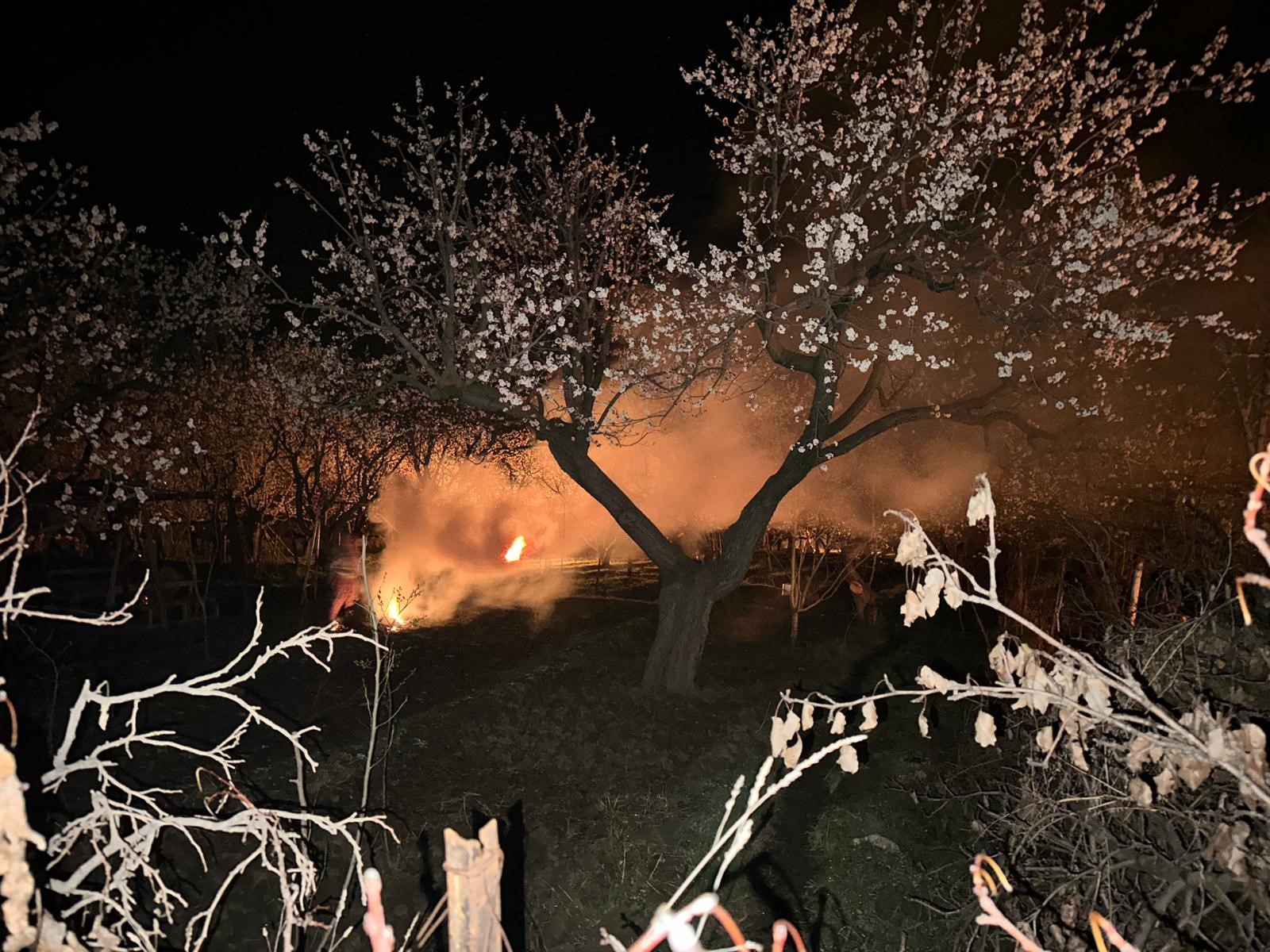 Kağızman’da uzun yıllardır devam eden ve eskiden gelen bir teknikle, bahçe sahipleri ağaçlarını korumaya aldı. Yakılan ateş, ot veya samanla harlanıp dumanın artması sağlanılıyor, daha sonra ortaya çıkan duman ve ısı ağaçlarda açan çiçeklerin içerirsindeki nemini kurutarak donmaya karşı koruyor.
