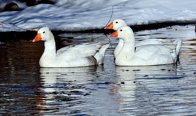 Yağbasan köyünde damızlık olarak beslenen kazlar, güneşin açmasıyla köy içinden geçen dereye girerek buz tutmayan kısımda yüzdü.