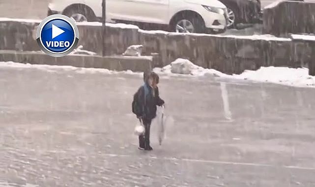 Görüntüler, zor hava şartlarına rağmen milli değerlere sahip çıkan öğrencinin duyarlılığını bir kez daha gözler önüne serdi.