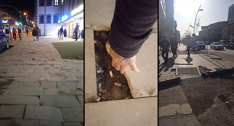 Acaba dökülen asfalt ve döşenen karolar mı çok kalitesizdi, yoksa kış mı çok ağır geçmişti? Sanırım ben gibi çoğu Erzurumlu da son günlerde son derece kötü olarak karşımıza çıkan ana yolları ve bu ana yollar üzerindeki kaldırımları görünce haklı olarak bu soruyu soruyor. Öyle ya. Erzurum’da hemen hemen her tarafta bozuk yol görüntüleri ve artık yürünemez duruma gelen kaldırımlar gözümüzün önünde.. Hemen hemen herkes de bu durumdan şikayetçi. Neredeyse durumdan rahatsız olmayan da yok gibi. Bu durumun özellikle Cumhuriyet Caddesi gibi şehrin en işlek caddesinde olması daha çok dikkat çekiyor ve bu tepkilere de neden oluyor. Lalapaşa camii karşısında ki Vakfı İşhanı önündeki kaldırımlardaki karo taşları bu konudaki sorunu daha çok açığa çıkarıyor.