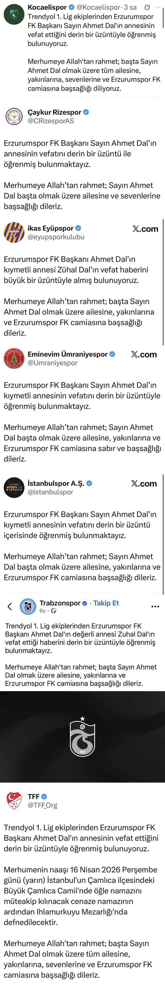 Türkiye Futbol Federasyonu başta olmak üzere Süper Lig ve 1. Lig kulüpleri, yayımladıkları mesajlarla Erzurumspor FK Başkanı Ahmet Dal’a başsağlığı dileklerini iletti. Mesajlarda, Zühal Dal’a Allah’tan rahmet, ailesine ve yakınlarına sabır temennisinde bulunuldu.