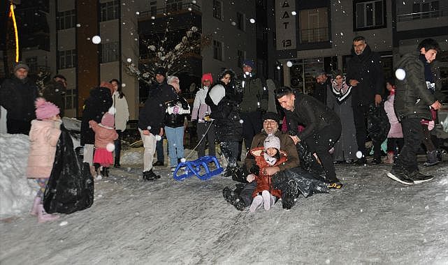 İlçede etkili olan kar yağışı, çocuklar için eğlenceye dönüştü.