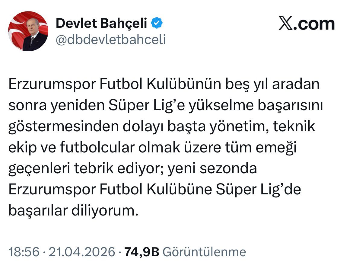 Milliyetçi Hareket Partisi (MHP) Genel Başkanı Devlet Bahçeli, Erzurumspor FK'nın 5 yıl aradan sonra yeniden Süper Lig'e yükselme başarısını kutladı . Sosyal medya hesabı üzerinden paylaşım yapan Bahçeli, mavi-beyazlı camiaya yeni sezonda başarılar diledi .