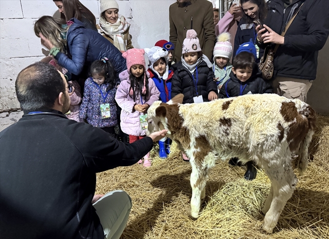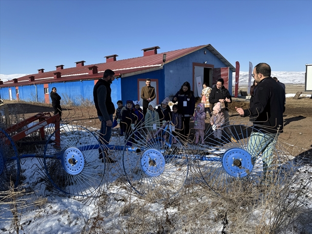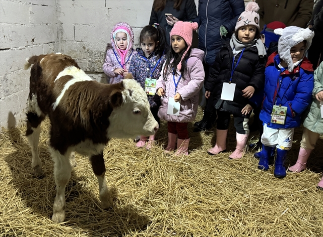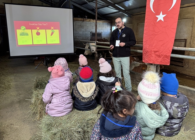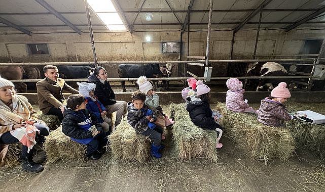 Aile ve öğretmenleri eşliğinde köydeki işletmeye gelen çocuklar, kendilerine ot balyalardan yapılan oturaklara oturdu, hayvanların olduğu ortamda ders gördü, hayvancılıkla alakalı deneyim edindi.