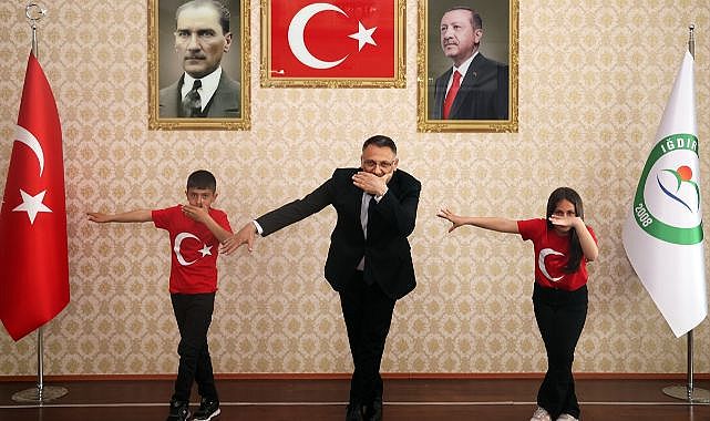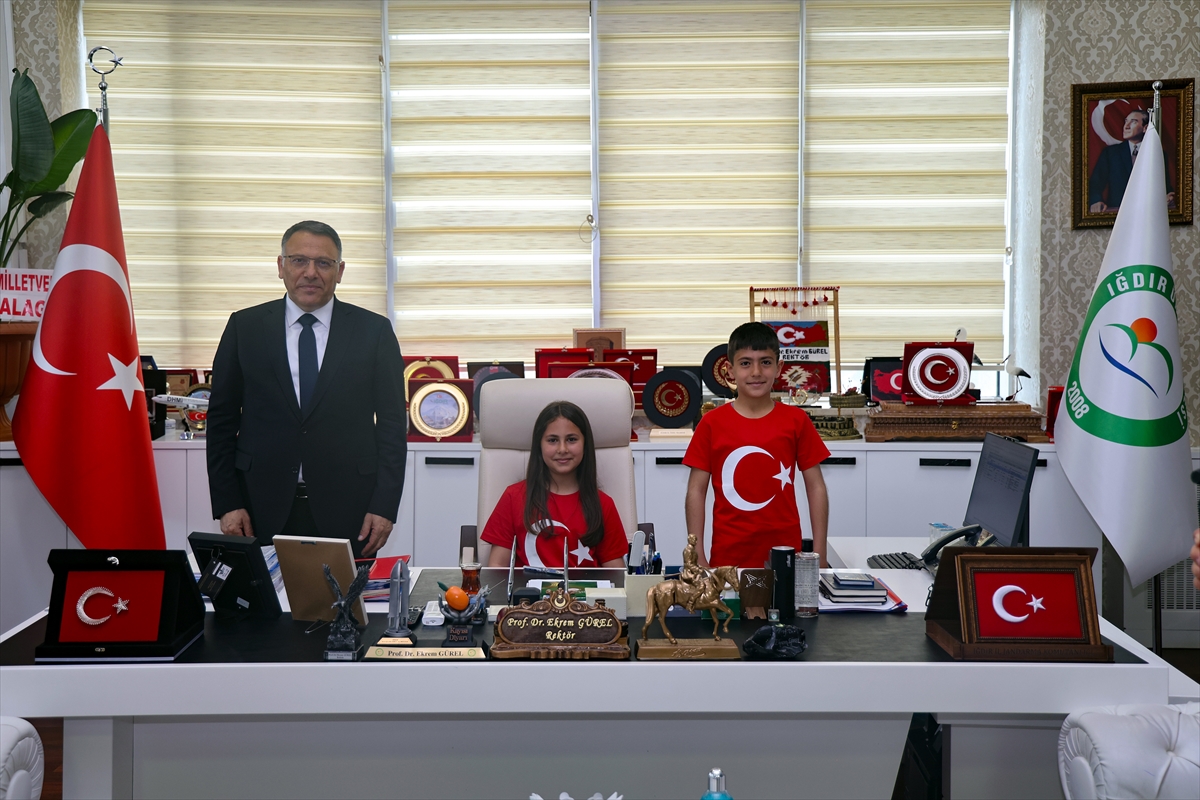 Kentteki 23 Nisan kutlamaları kapsamında Iğdır Üniversitesine gelen Melekli Atatürk İlkokulu öğrencilerinden Defne Miray Çatalkaya rektörlük koltuğuna, Poyraz Varol ise rektör yardımcılığı koltuğuna oturdu.
