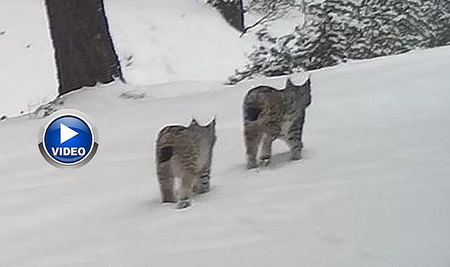 Görüntülerde, karla kaplı arazide gezinen 2 vaşağın yürüyerek ormanın derinliklerine doğru gözden uzaklaşması yer alıyor.