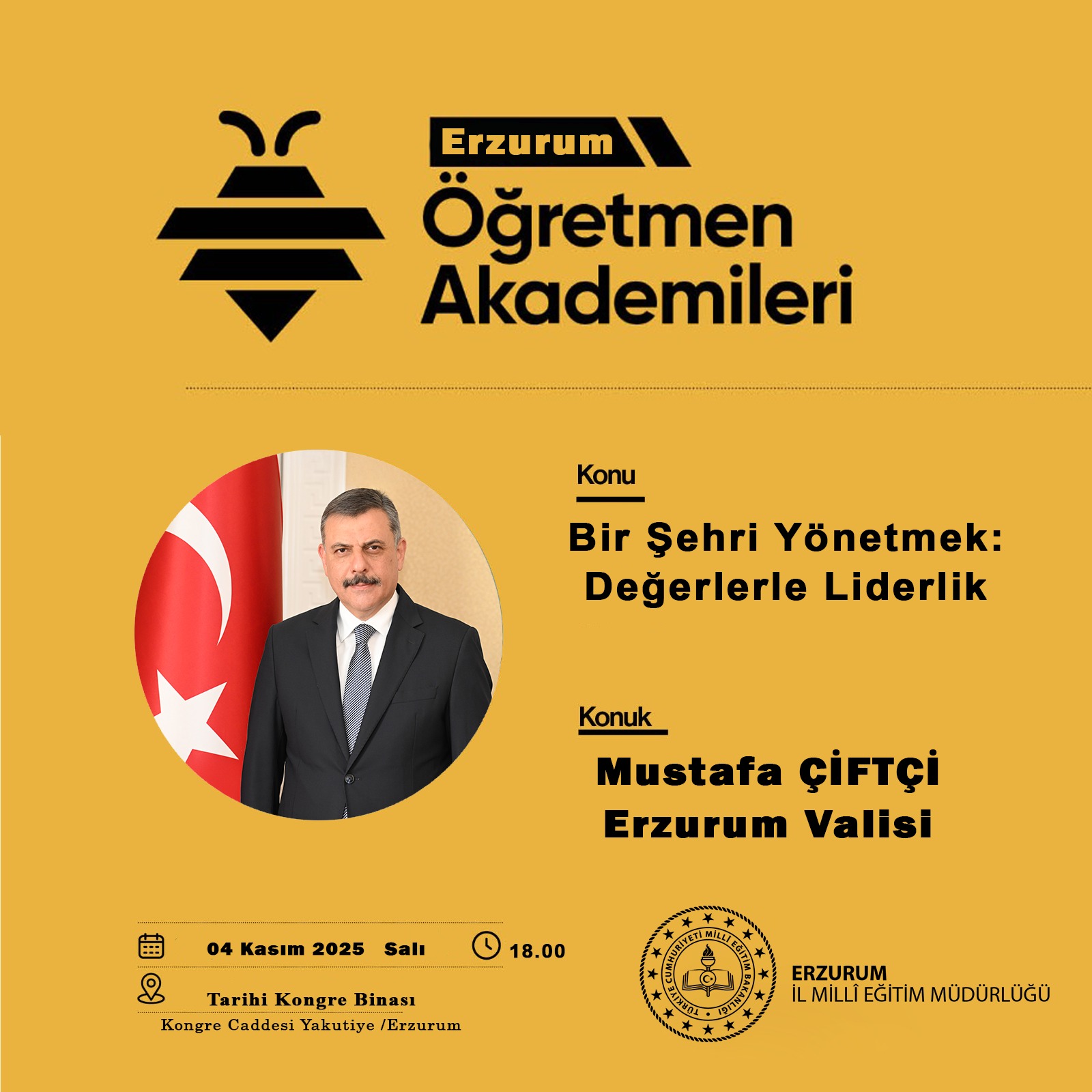Bu kapsamda 4 Kasım 2025 Salı günü saat 18.00’de Tarihi Kongre Binası’nda gerçekleştirilecek etkinliğin konuğu ise Erzurum Valisi Mustafa Çiftçi olacak. Vali Çiftçi, “Bir Şehri Yönetmek – Değerlerle Liderlik” başlıklı konuşmasıyla öğretmenlerle buluşacak.