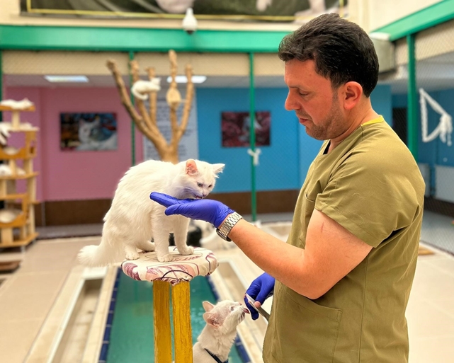 "İlk etapta 30 kediyle bu işe başladık" Van Kedi Villası Hayvan Sorumlusu Mehmet Atar Bayır, ilk olarak Veteriner Fakültesi'nin bodrum katında bu işe başladığını belirtti. Başladıkları ilk yıllarda sokaklardan kedileri topladıklarını ifade eden Bayır, "O zamandan beri Van kedileriyle ilgileniyorum. Yaklaşık 30 yıl oldu kedilerle beraberim. Van kedisinin nesli tükenmek üzereydi. Bu çalışma bir doktora projesiydi ve bu proje sayesinde Van kedisine sahip çıkıldı. Her türlü canlıyla ilgilenmek zordur tabii ki. Van kedisinin de kendine has meşakkati, ayrı bir zorluğu vardır. Ancak bir işi severek yaptığınızda her şey insana daha kolay geliyor. Ben sabah işe geldiğimde önce kedilerin arasında dolaşırım. Herhangi bir sıkıntıları, hastalıkları var mı diye kontrol ederim. Bir problem varsa üstlerime bildiririm, yoksa rutin bakımlarına geçeriz. Temizlik, göz bakımı ve genel sağlık kontrollerini hayvan sağlığı personelimizle birlikte yaparız" dedi.