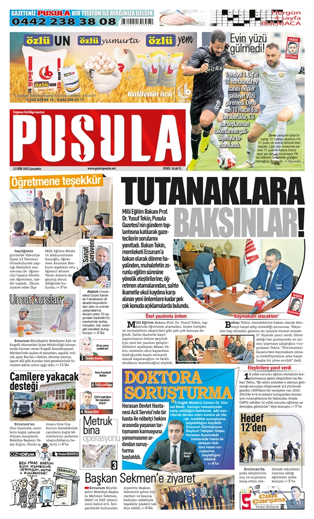 Geçtiğimiz yılda Pusula Gazetesi’nin gündem toplantılarına, Milli Eğitim Bakanı Prof. Dr. Yusuf Tekin, önceki dönem İçişleri Bakanı Erzurum Milletvekili Selami Altınok, BBP Genel Başkanı Mustafa Destici, YRP Genel Başkanı Dr. Fatih Erbakan, Erzurum Valisi Mustafa Çiftçi, Büyükşehir Belediye Başkanı Mehmet Sekmen, Atatürk Üniversitesi Rektörü Prof. Dr. Ahmet Hacımüftüoğlu, Emniyet Müdürü Onur Karaburun, Aras EDAŞ Genel Müdürü Fikret Akbaş, , AK Parti İl Başkanı İbrahim Küçükoğlu ve MHP Erzurum İl Başkanı Adem Yurdagül katıldı. Toplantılarda güncel meseleler üzerinde konuklarımıza sorular yöneltildi, sorunlar ve çözüm yolları üzerinde görüşlerine başvuruldu.