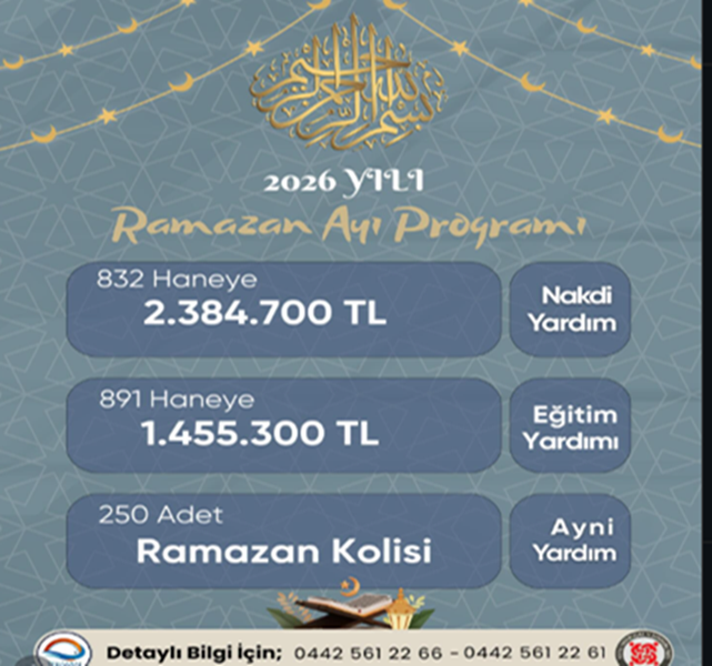 Vakfın sosyal dayanışma anlayışıyla yürüttüğü program çerçevesinde ilçede yaşayan ihtiyaç sahibi vatandaşlara toplam milyonlarca liralık destek sağlanması planlanıyor. Açıklanan verilere göre Ramazan ayında sekiz yüz otuz iki haneye iki milyon üç yüz seksen dört bin yedi yüz lira nakdi yardım yapılacak. Bunun yanı sıra sekiz yüz doksan bir haneye bir milyon dört yüz elli beş bin üç yüz lira eğitim yardımı verilecek. Ayrıca iki yüz elli adet Ramazan kolisi ayni yardım olarak ailelere ulaştırılacak.