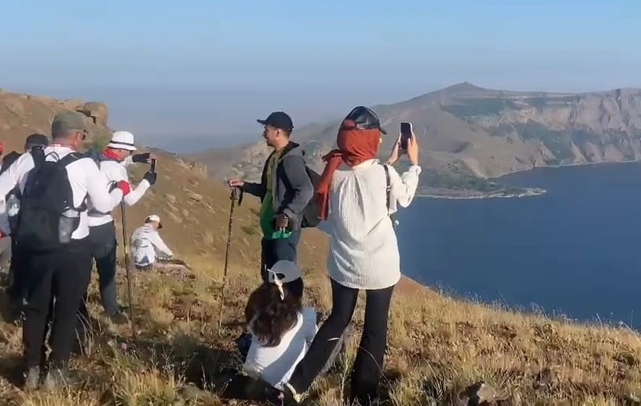 Nemrut Dağı'nın Tatvan yamacında tırmanış yapan doğaseverler, zirve yürüyüşü boyunca rüzgarın etkisiyle oldukça zorlu bir parkurdan geçtiler. Katılımcılardan Muazzez Piral, "Buraya gelmeden önce bu kadar güzel bir manzara ile karşılaşacağımızı bilmiyorduk. Nemrut Krater Gölü'nü şu an kuş bakışı görüyoruz. Dünyanın ikinci ve Türkiye'nin ise en büyük krater gölü olan Nemrut Krater Gölü, çok sayıda ödül almış bir yerdir" diye konuştu.