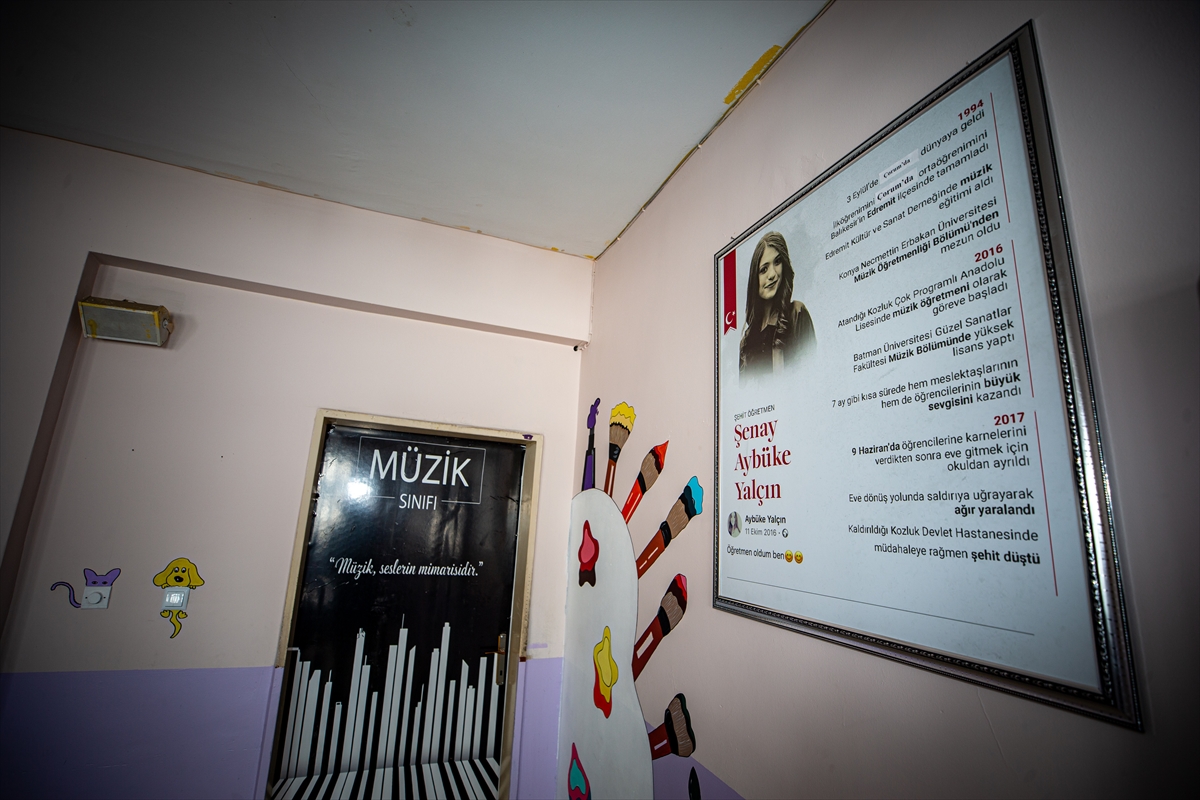 Org, keman, saz ve bağlama gibi enstrümanlarla donatılan sınıfa, şehit öğretmen Şenay Aybüke Yalçın’ın fotoğrafları asıldı. Yaşam öyküsü sınıf duvarlarında anlatılan şehit öğretmenin izinde giden öğrenciler, yeteneklerini keşfedip müzik alanında kendilerini en iyi şekilde yetiştirmek istiyor.
