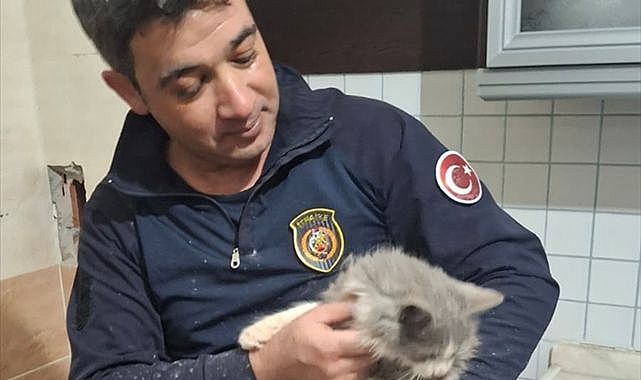 Bölgeye yönlendirilen itfaiye ekipleri, duvarı deldi ve havalandırma boşluğunda sıkışan kediyi kurtardı.