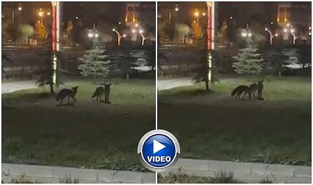 Bayburt'ta şehir merkezine inen iki tilki, gece saatlerinde birbirleriyle oynarken görüntülendi.