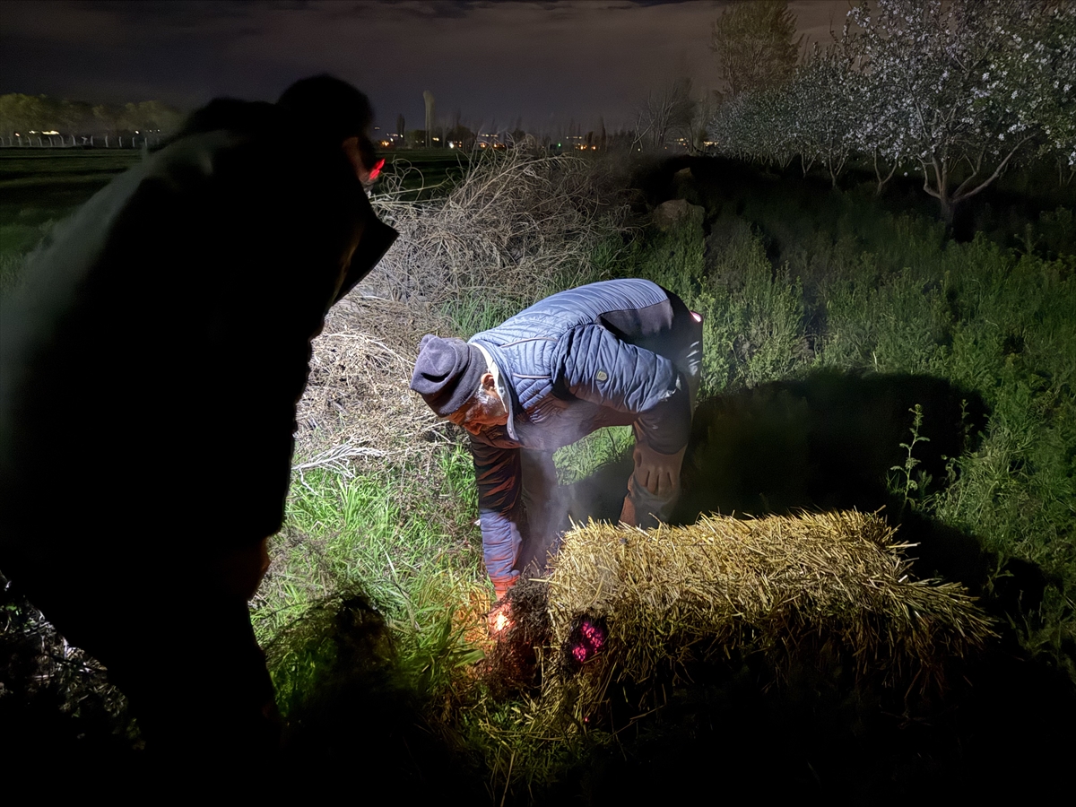 Bahçede nöbet tuttuklarını belirten Yıldırım, "Dağlarda kar var, rüzgar sert esiyor. Bahçemizi ve meyvemizi dondan korumak için ateş yaktık. Hem ot balyası hem de hayvan gübresi var. Gündüzden hazırlığımızı yaptık." dedi.