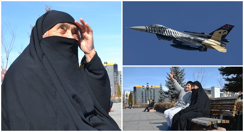 Erzurum Büyükşehir Belediyesi, SOLOTÜRK ekibinin kent semalarında selamlama uçuşu yapacağını duyurmasıyla 78 yaşındaki Raile Laçin de torunlarıyla birlikte bekledi. Hava muhalefetinden dolayı rötarlı olarak gerçekleşen uçuşu soğuğa rağmen 1,5 saat boyunca bekleyen Raile Nine, gözlerini bir an olsun gökyüzünden ayırmadı. Yaşlı kadının F-16 uçağının görüldüğü andaki sevinci ise görülmeye değerdi.