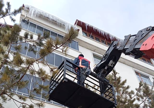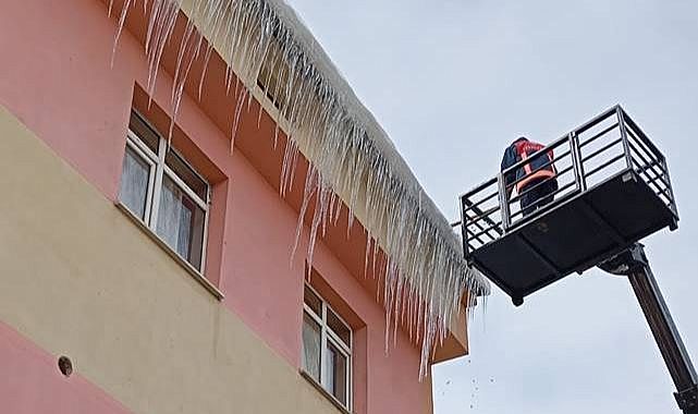 Soğuk hava şartları nedeniyle meydana gelen ve özellikle yayalar için tehlike oluşturan buz sarkıtları, ekiplerin kontrollü müdahalesiyle kırılarak kaldırıldı. Çalışmaların, vatandaşların can ve mal güvenliğinin korunması amacıyla riskli bölgelerde öncelik verilerek yürütüldüğü bildirildi.