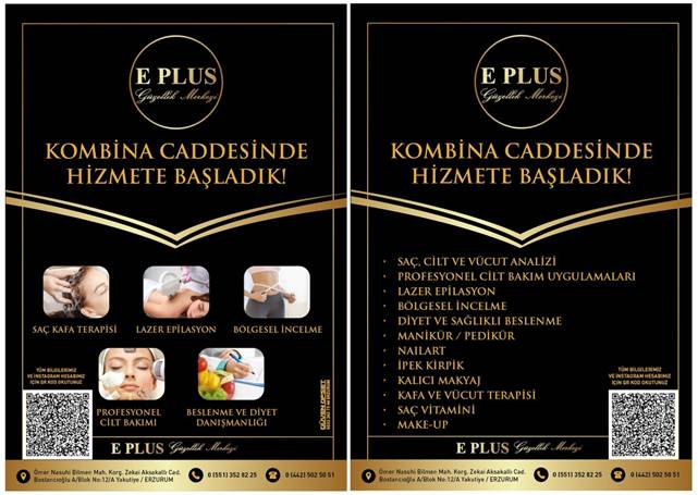 E Plus Güzellik Merkezi’nde saç, cilt ve vücut analizi, profesyonel bakım uygulamaları, lazer epilasyon, bölgesel incelme, beslenme danışmanlığı, manikür-pedikür, ipek kirpik, kalıcı makyaj, kafa terapi ve daha birçok hizmet sunuluyor.