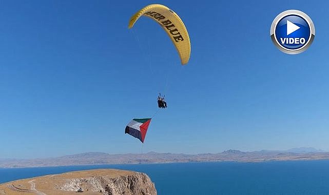 Antalyalı Yamaç Paraşütü Pilotu Mehmet Sadık Göller, takım arkadaşıyla birlikte Van Gölü semalarında Filistin bayrağı açtı.