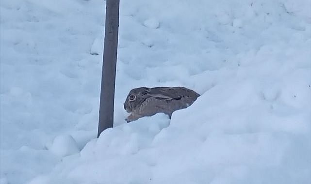 İlçede doğal yaşam alanında yiyecek bulamayan bir yabani tavşan, okul bahçesinde yiyecek ararken görüntülendi.