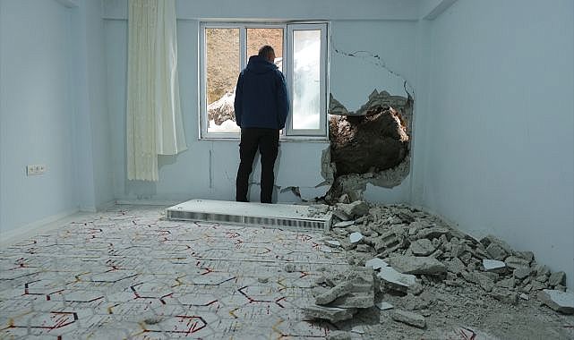 Karşıyaka Mahallesi'nde yamaçtan kopan büyük bir kaya parçası Yusuf Dayan'a ait 4 katlı binanın giriş katında bulunan dairedeki odanın duvarına çarptı.