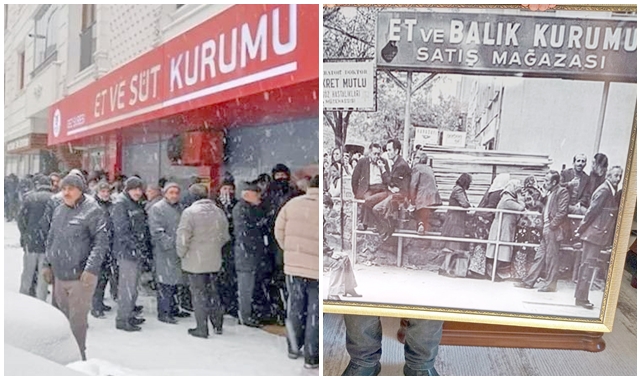 Ramazan ayının yaklaşması ile birlikte Et ve Süt Kurumu satış mağazasının önünde biriken yoğunluk bir hayli artarken, aslında bu kuyrukların bir geçmişi var. 1960’lı yılların başlarında Et ve Süt Kurumu olarak da bilinen kombina satış mağazalarında başlamış bu kuyruklar. Yıllar geçtikçe kurum yenilenmiş, hatta ismi bile değişmiş ama mağazalarının önünde ki kuyruklar hiç değişmemiş. Fotoğrafına yer verdiğimiz kuyruk, bugün ki kuyruklardan farksız. Yer, mevsim önemli değil. Ha Ankara, ha Erzurum, hiç farketmiyor. 1969 yılında Ankara’da Et ve Balık Kurumu EBK’nın önünde biriken ve Erzurum İl Müdürlüğü’nin hizmet binasının birinci katında da asılı bulunan et kuyruğunun fotoğrafı, bize aslında bu kuyrukların tarih boyunca hep olduğunu da gösteriyor.