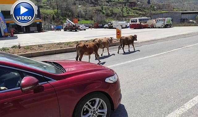 Yola çıkan büyükbaşlar trafiği birbirine kattı!