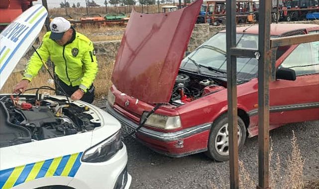 Ekipler, polis otosunu arızalanan araca yaklaştırarak kendi ekip aracından akü takviyesi yaptı.