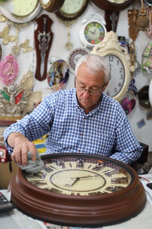 Ağrı’da 35 yıldır saat tamirciliği yapan 62 yaşındaki Osman Erincik, gözü gibi baktığı saatlerini müşterilerin beğenisine sunuyor.